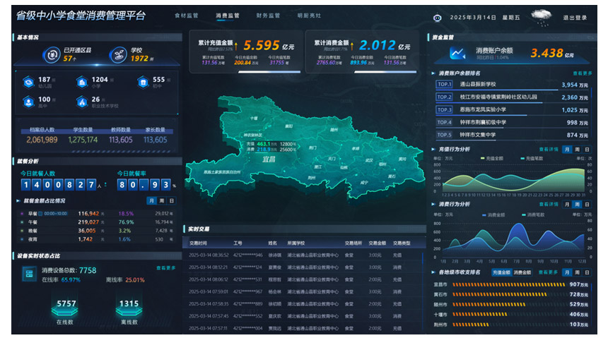 協(xié)同教育云平臺-智慧消費(fèi)管理系統(tǒng),于2024年12月16日正式在湖北上線,截至目前(2025.4.14),威爾數(shù)據(jù)平臺一期部署消費(fèi)設(shè)備8172臺,覆蓋湖北全省12個地市、59個區(qū)縣,建設(shè)2105所中小學(xué),惠及140萬師生,67萬家長,2025年春季開學(xué)至今,系統(tǒng)累計(jì)充值322萬筆,充值金額7.6億元,交易6127萬筆。