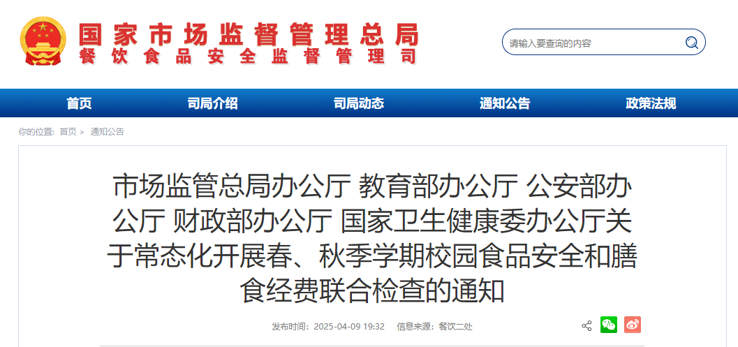 ?五部門聯(lián)合部署常態(tài)化檢查2025.4.9):市場監(jiān)管總局、教育部、公安部、財(cái)政部、國家衛(wèi)生健康委聯(lián)合印發(fā)《關(guān)于常態(tài)化開展春、秋季學(xué)期校園食品安全和膳食經(jīng)費(fèi)聯(lián)合檢查的通知》,明確每學(xué)期開學(xué)后1個月內(nèi)啟動聯(lián)合檢查。